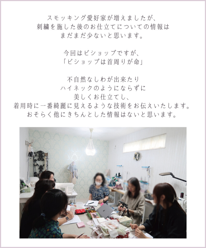 スモッキング刺繍が終わったビショップを実演しながら完成させます。