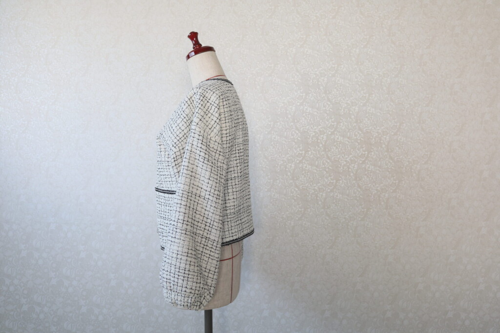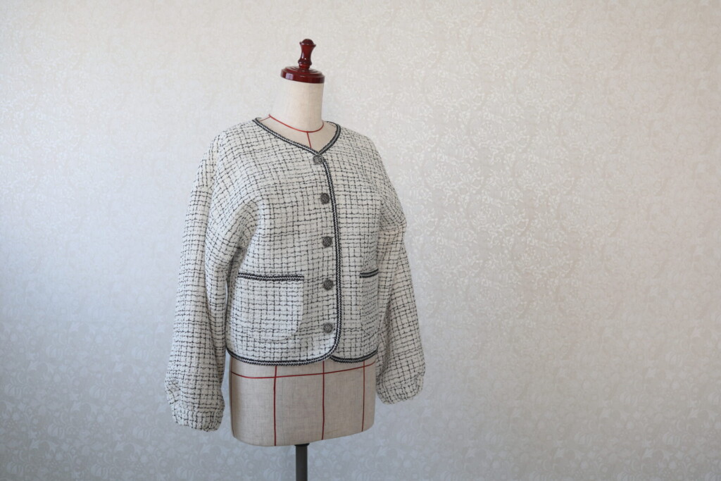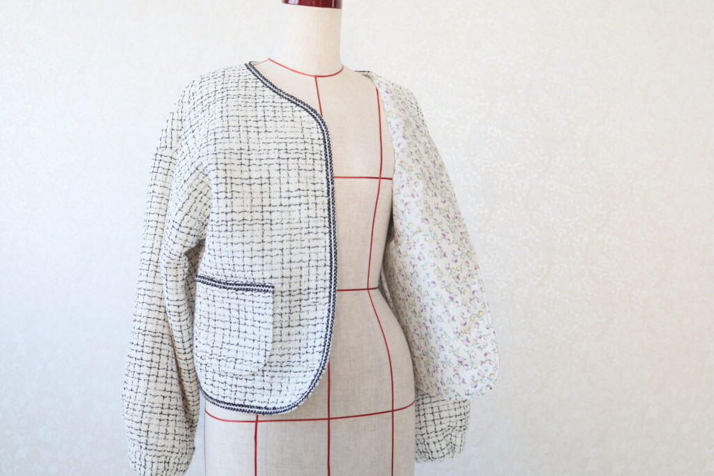 東京・日暮里で仕入れたツイードでブルゾンを作りましたブレードの縫い方、ポケットの作り方のコツをお伝えします。裏地はリバティプリント レイニングローズバッズ Lining : [Raining Rosebuds] Liberty print